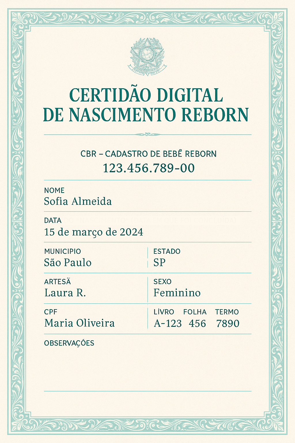Transforme o amor pelo seu bebê reborn em um registro eterno. Sua certidão digital, registrada oficialmente no Cartório Reborn, com número exclusivo de CBR — o “CPF” do seu bebê reborn.